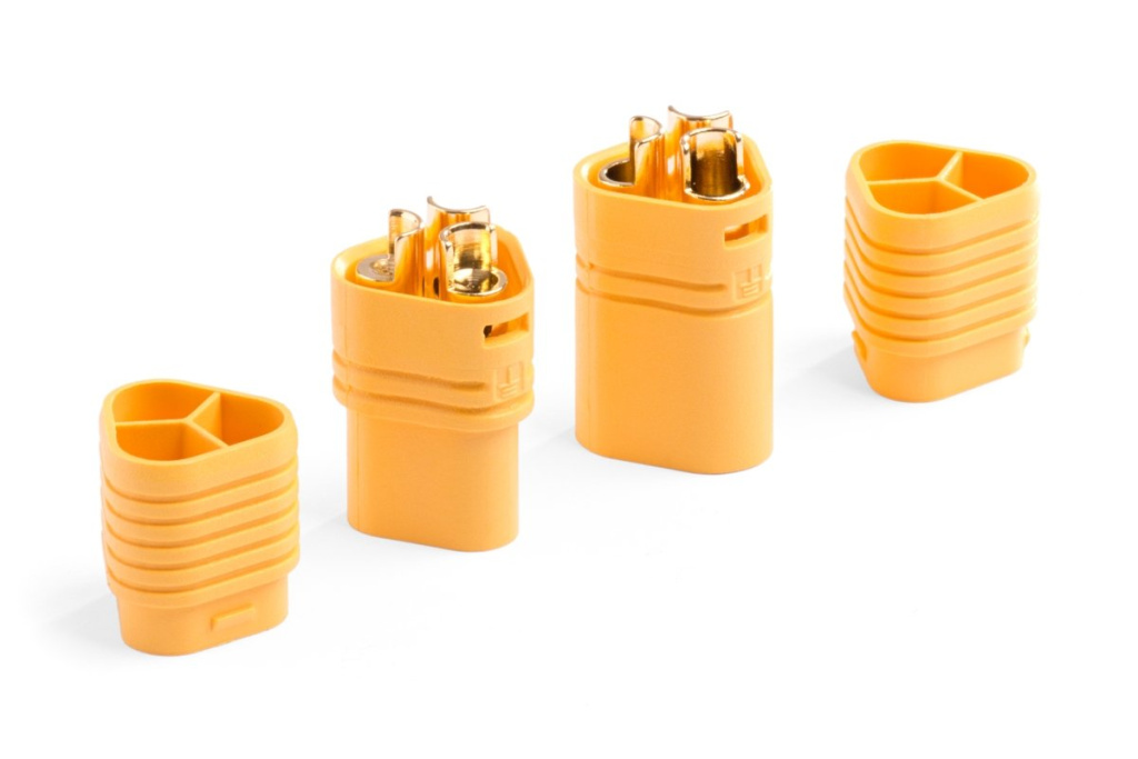 Tříkolíkový silový konektor se zlacenými kontakty se zatížitelností max. 60 A. Pro kabely o průřezu max. 3,3 mm2 (12AWG). Přechodový odpor 0,55 mOhm, max. 500 V. Ideální pro propojování střídavých elektromotorů a regulátorů. Balení 1 pár.
